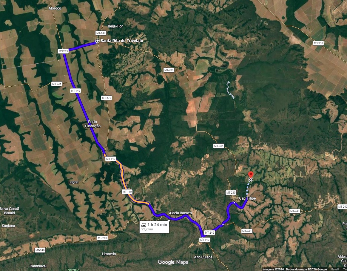 - Imóvel rural com área de 2.032,3398ha (DOIS MIL TRINTA E DOIS HECTARES, TRINTA E TRÊS ARES E NOVENTA E OITO CENTIARES), denominado Fazenda Iran I, situado no município de Santa Rita do Trivelato-MT, e os seguintes limites e confrontações: M01-M02 com azimute verdadeiro de 57°52'58", com distância de 3.022,26 metros, limitando com terras de Carlos Daly Dalcol Trevisan ; M0 2-M03 com azimute verdadeiro de 102º08'06", com distância de 817,35 metros, limitando com margem esquerda do Rio Teles Pires. M-03-M-04 azimute verdadeiro de 64º36'10", com distância de 1 . 010, 13 metros, limitando com margem esquerda do Rio Teles Pires. M04-M05 com azimute verdadeiro de 105° 38' 16", com distância de 774, 87 metros, limitando com margem esquerda do Rio Teles Pires. M05-M06 com azimute verdadeiro de 200º37'23", com distância de 1.361,28 metros, limitando com margem esquerda do Rio Teles Pires. M06-M07 com azimute verdadeiro de 103°29' 53", com distância de 959,89 metros, limitando com margem esquerda do Rio Teles Pires. M07-M08 com azimute verdadeiro de 41°47'40", com distância de 920,94 metros, limitando com margem esquerda do Rio Teles Pires. M08-M09 com azimute verdadeiro de 110°39'10", com distância de 658,28 metros, limitando com margem esquerda do Rio Teles Pires. M09-Ml0 com azimute verdadeiro de 207°04'09", com distância de 551, 04 metros, limitando com margem esquerda do Rio Teles Pires. MlO-Mll com azimute verdadeiro de 190º07'21'', com distância de 1.288,27 metros , l imitando com margem esquerda do Rio Teles Pires. Mll-M12 com azimute verdadeiro de 245°39'52", com distância de 554,77 metros, limitando com margem esquerda do Rio Teles Pires. Ml 2-Ml3 com azimute verdadeiro de 192°16'40", com distância de 423,61 metros, limitando com margem esquerda do Rio Teles Pires. Ml3-Ml4 azimute verdadeiro de 254 °21 '39" com distância de 4.867,06 metros, limitando com terras de Waldemir Benedito Ribeiro e Aramis Ranto Stoterau. M-14-M0l com azimute verdadeiro de 343º05'36", com distância de 3.237,76 metros limitando com terras de Valdecir Roque Robledo. Resumo dos limites: Norte: Carlos Daly Dalcol Trevisan e margem esquerda DO Rio Teles Pires; Sul: Waldemir Benedito Ribeiro e Aramis Renato Stoterau; Leste: Margem esquerda do Rio Teles Pires; Oeste: Valdecir Roque Robledo. Ponto de Amarração o (P.A.) Ponto de Amarração encontra-se na barra do Rio Teles Pires pela sua margem esquerda com o Córrego Capão Grande, pela sua margem direita, local onde encontra-se cravado o marco M-13 do referido lote com coordenada Geográficas de 14º07'40"S e 54º53 '56"WGR e coordenadas OTM de N: 8.437.200,00m e E: 727.000,00m. Via de Acesso. O acesso ao referido lote é feito partindo-se da sede do município de Rosário Oeste pela BR-163 no sentido para Diamantino até a o entroncamento com a MT-240, daí segue pela MT-240 até ao encontramento com a MT-140 no lugar denominado Sete Placas, daí segue por estradas vicinais 25 KM aproximadamente, até encontrar o referido lote